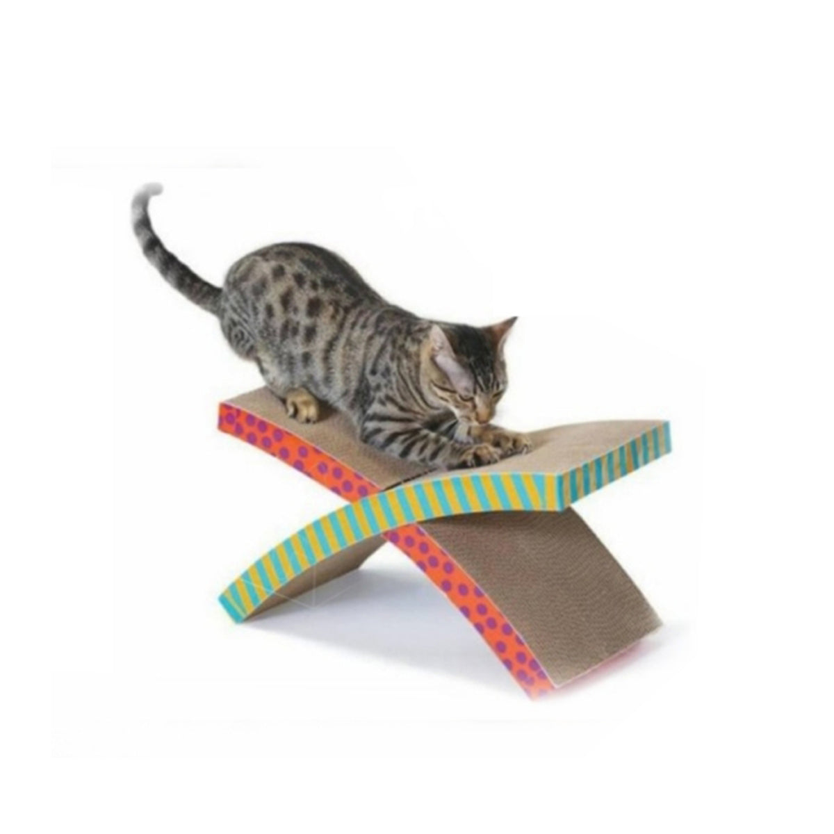Nuestro increíble rascador hamaca en X, en cartón corrugado ideal para que tus gatos afilen uñas y tengan un hermoso punto de descanso.